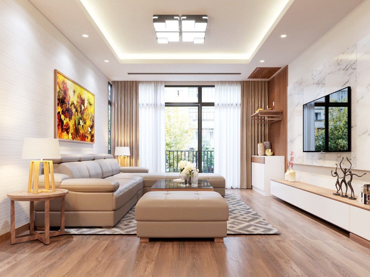 Toàn bộ nội thất đặt thiết kế theo phong cách hiện đại, đồ gỗ cao cấp, còn rất mới và sử dụng tốt.